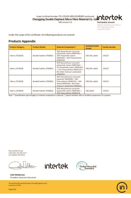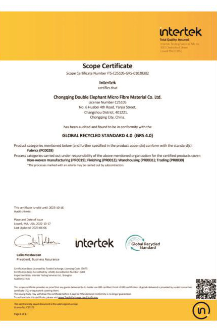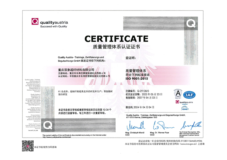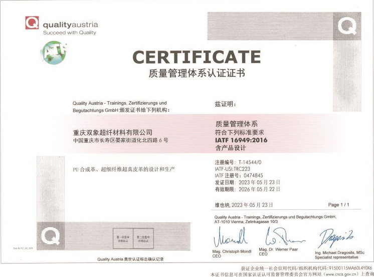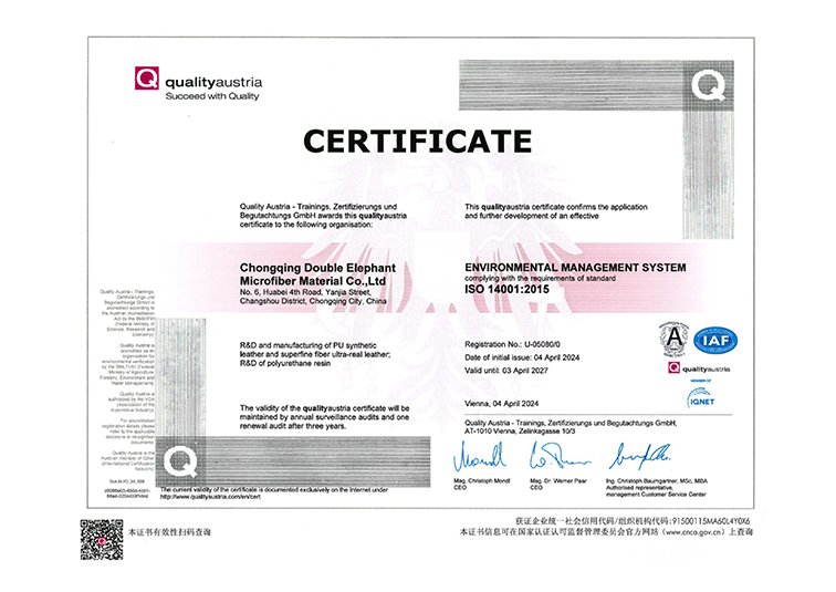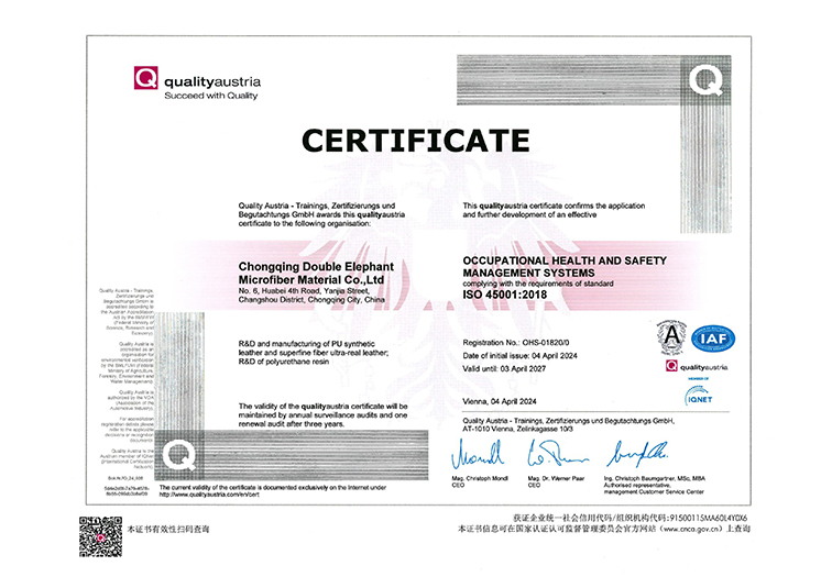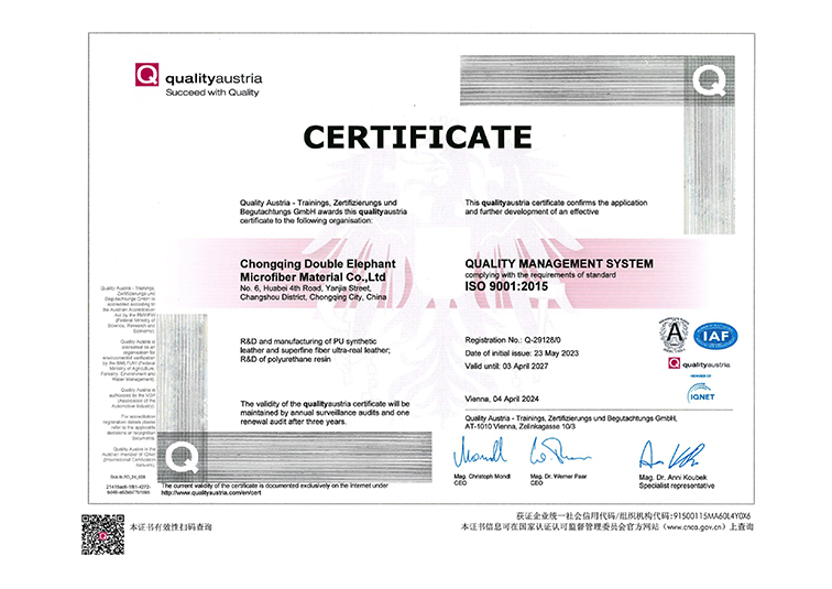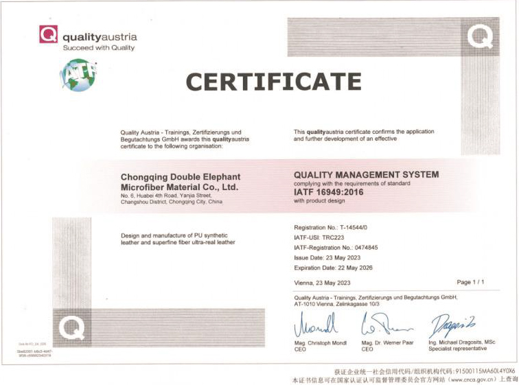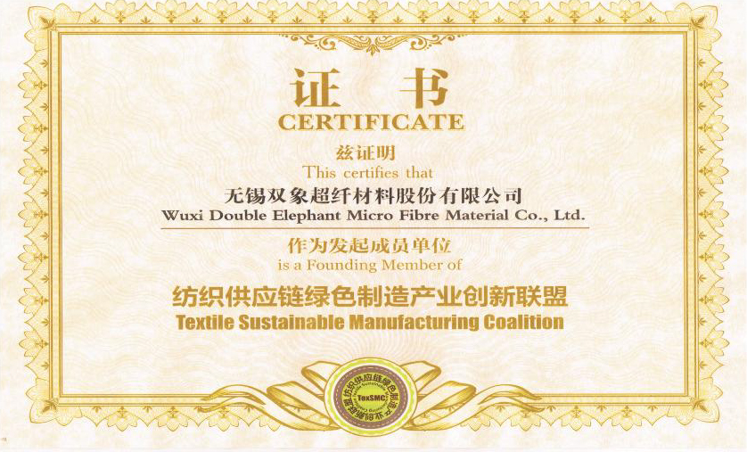 DE adheres to new development concept of innovation, coordination, green development, openness and sharing, takes high-quality development as the goal positioning, and strives to build a modern advanced manufacturing enterprise. DE is China's leading enterprise in artificial leather & synthetic leather manufacturing industry, Jiangsu Province high-tech enterprise , Jiangsu Province 100 key private science and technology enterprises, has undertaken and completed the "national 863 plan project", "Jiangsu Province major scientific and technological achievements transformation project" and other national and provincial major scientific research projects, has undertaken more than 30 national and industry standards drafting and revision work. It was awarded the title of "China Microfiber Synthetic Leather Innovation Research and Development Base" by China Plastics Processing Industry Association, In 2019, in accordance with the requirements of leading technology, intelligent manufacturing, advanced management and environmental friendliness, DE has built the Double Elephant microfiber Chongqing production base, and in April 2022, the "annual output of 30 million meters of microfiber material phase l project" was put into operation, and was recognized as "Chongqing Digital Workshop" by Chongqing Economic and Information Technology Commission.